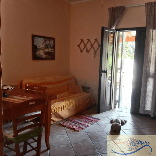 La struttura da 4+2 posti letto, presenta all’entrata il soggiorno, con un tavolo, tv, divano-letto matrimoniale, dispensa con bicchieri, tovaglie e canovacci, frigo, ventilatore a soffitto e aria condizionata.